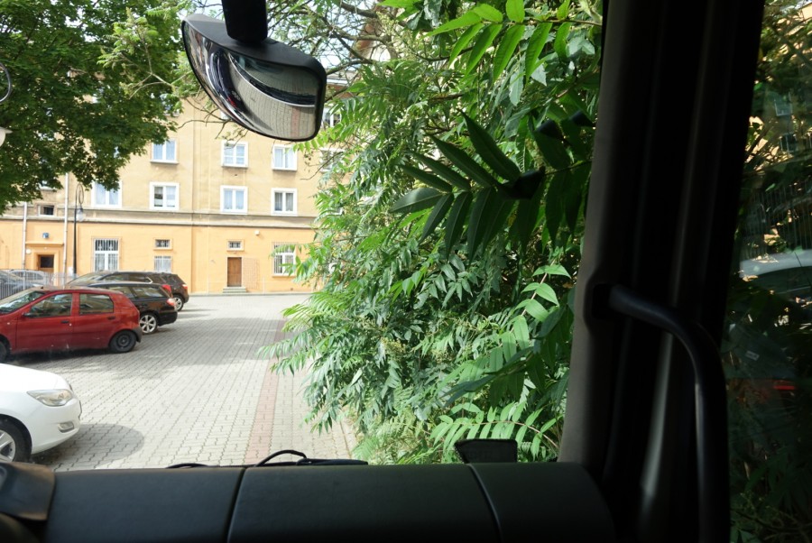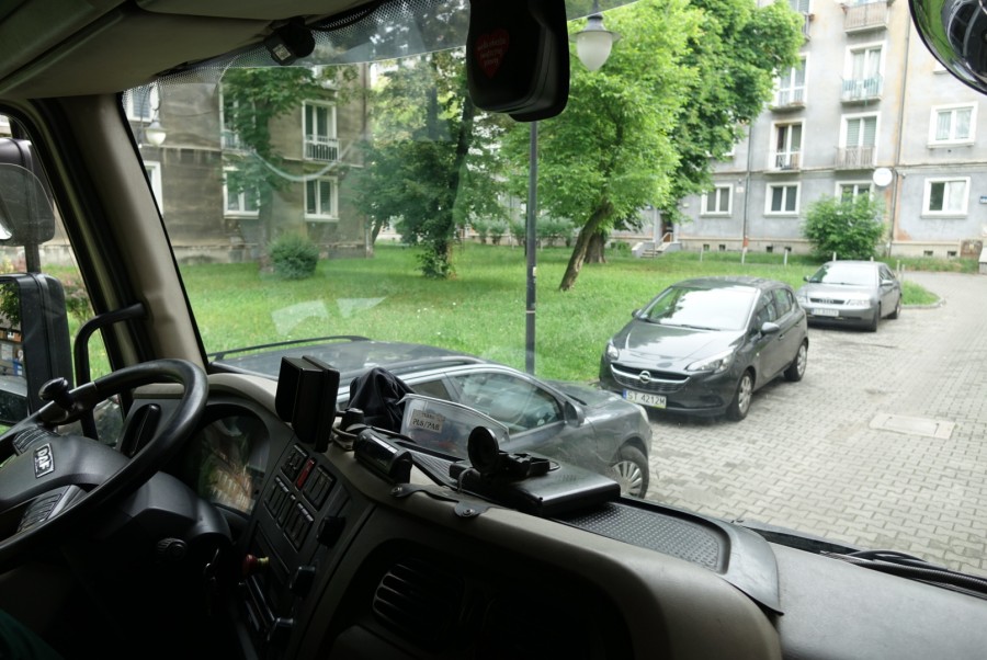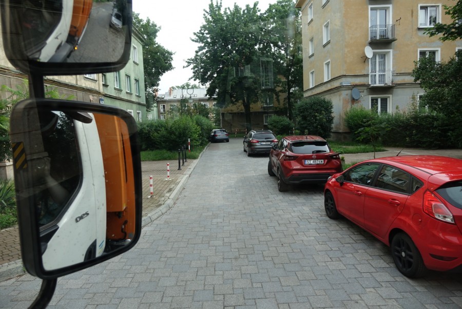 „Podróż”, w jaką Was – drodzy czytelnicy – dzisiaj zabieramy, nie będzie do końca przyjemna i to bynajmniej przez stereotypowe zapachy. Chodzi o nasze podejście jako mieszkańców, sąsiadów, obywateli, które staje się coraz bardziej egoistyczne. Zarówno na porannej, jak i popołudniowej zmianie, ulicami Tychów jeździ kilkanaście śmieciarek, których kierowcy mają prosty cel. Załadować i bezpiecznie dowieźć do celu tony odpadów, które codziennie wytwarzamy. Zajęcie niezbędne, pożyteczne, wymagające siły fizycznej. Okazuje się jednak, że równie istotną cechą kierowcy-ładowacza śmieciarki jest… odporność psychiczna i szeroko pojęte umiejętności komunikacyjne. Symboliczna fotograficzna podróż, jaką dzisiaj prezentujemy, jest zapisem tylko krótkiej rundy wokół jednego z tyskich osiedli. Trzeba przyznać, że umiejętności jazdy samej w sobie w tak wąskim terenie, muszą być na wysokim poziomie, ale gdy dodamy do tego niepoprawnie zaparkowane samochody, mamy przysłowiową „wyższą szkołę jazdy”. A zimą? Trudno to sobie wyobrazić.